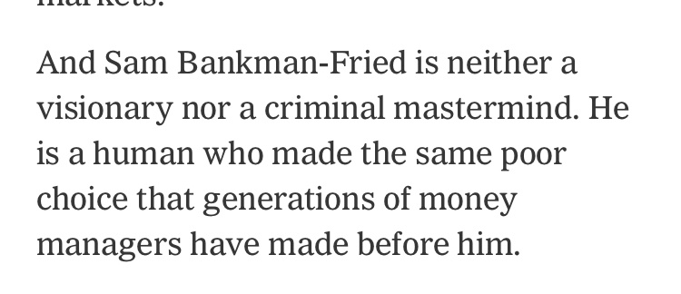No, SBF is a once-in-a-generation crook and fraud. Someone who so brazenly stole from every one of his clients that his corporate governance was worse than Enron’s. He is not the kind of person who needs to be painted as a normal guy just like the rest of us who made a few mistakes, he is the kind of guy whose active and willful theft has left many many people much worse off.